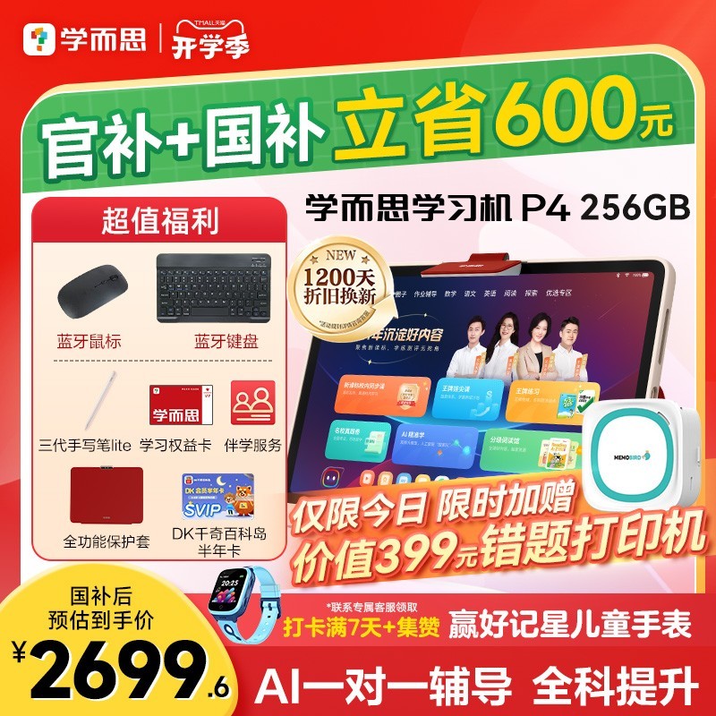 当前天猫商城正在限时促销,学习机p4官方标配版原价3299元,使用满减券叠加国家补贴后仅需2699.6元即可入手,直降近600元,性价比极高,还加赠错题打印机,是家长为孩子选购学习设备的不二之选。