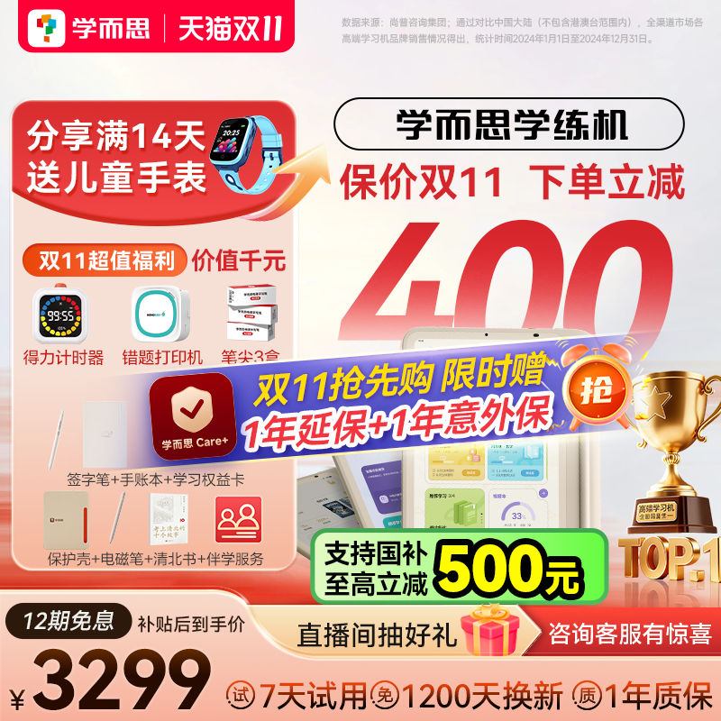 学而思网校推出的学而思学练机,是一款集学习机、阅读机功能于一体的大屏护眼平板电脑,还是ai智能学习机,能满足小学到高中不同阶段的学习需求。这款学练机颜色为学而思学练机专属,内存容量达128gb,采用官方标配套餐。在天猫商城,它正在进行促销活动,可使用商品详情页领取的满3000元减200元优惠券,还能享受国家补贴8.5折起(减500元)。