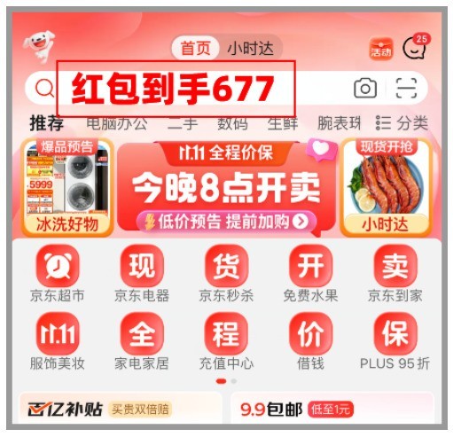 在2023年京东双十一11活动时间内,在京东上搜索双11红包领取口令「红包到手677」搜索进入即可领取成功,最高可领11111元京享红包。