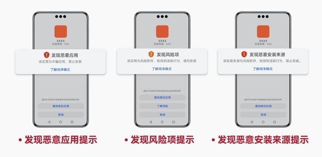 防止风险发生的第一步是预测风险,在华为用户安装应用时,系统会对应用进行全面“安检”,逐项扫描应用“零件”,如应用存在安全风险,设备将会通过弹窗提醒该应用可能存在的潜在风险,建议用户谨慎安装,用户可以选择“取消”选项取消本次安装。同时用户可以选择“查找类似应用”,通过华为应用市场安装经过安全检测的应用。